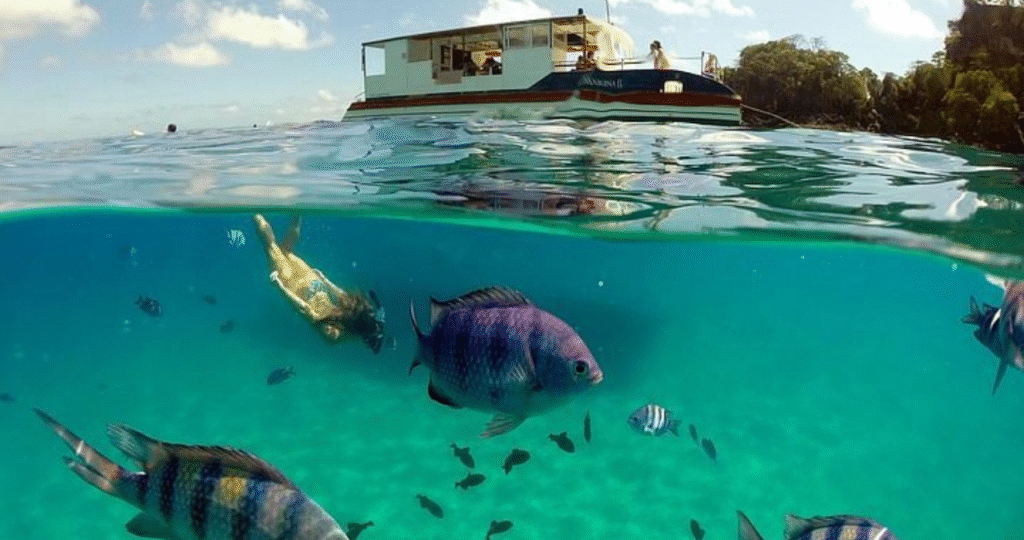 Descer do barco e sentir a água morna nos joelhos, com a areia fina sob os pés, a quilômetros da praia, é uma sensação que foto nenhuma consegue traduzir. Você coloca a máscara de snorkel, mergulha o rosto e o mundo se transforma. É um silêncio gostoso, quebrado apenas pela sua própria respiração, enquanto cardumes de peixinhos prateados e coloridos passam por você sem a menor cerimônia, curiosos.