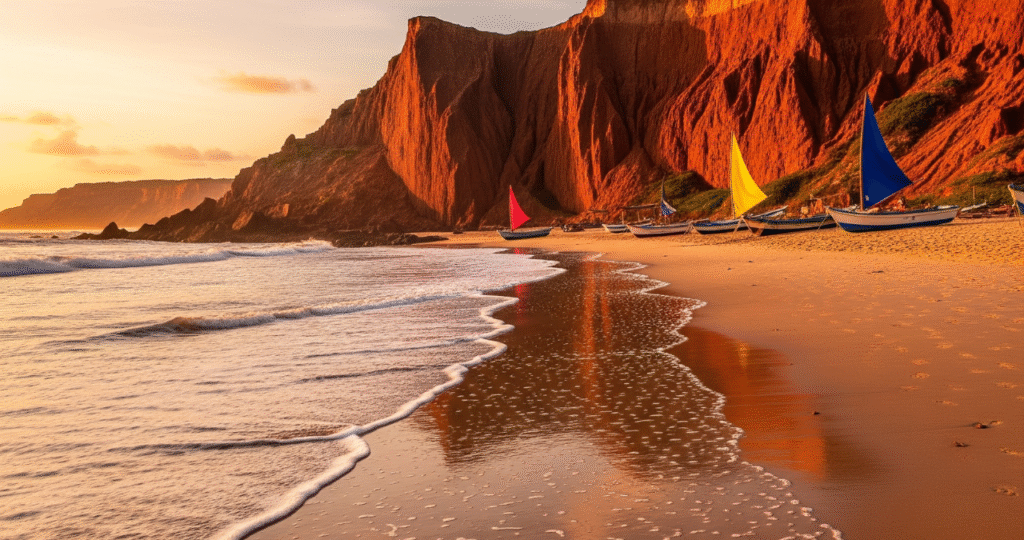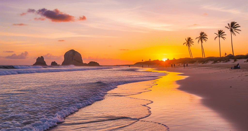 Aí o sol começa a baixar, pintando as falésias com uma luz dourada. Você volta da praia com o sal na pele, o cabelo ainda úmido, e sente a mudança no ar. As luzes dos lampiões começam a acender.